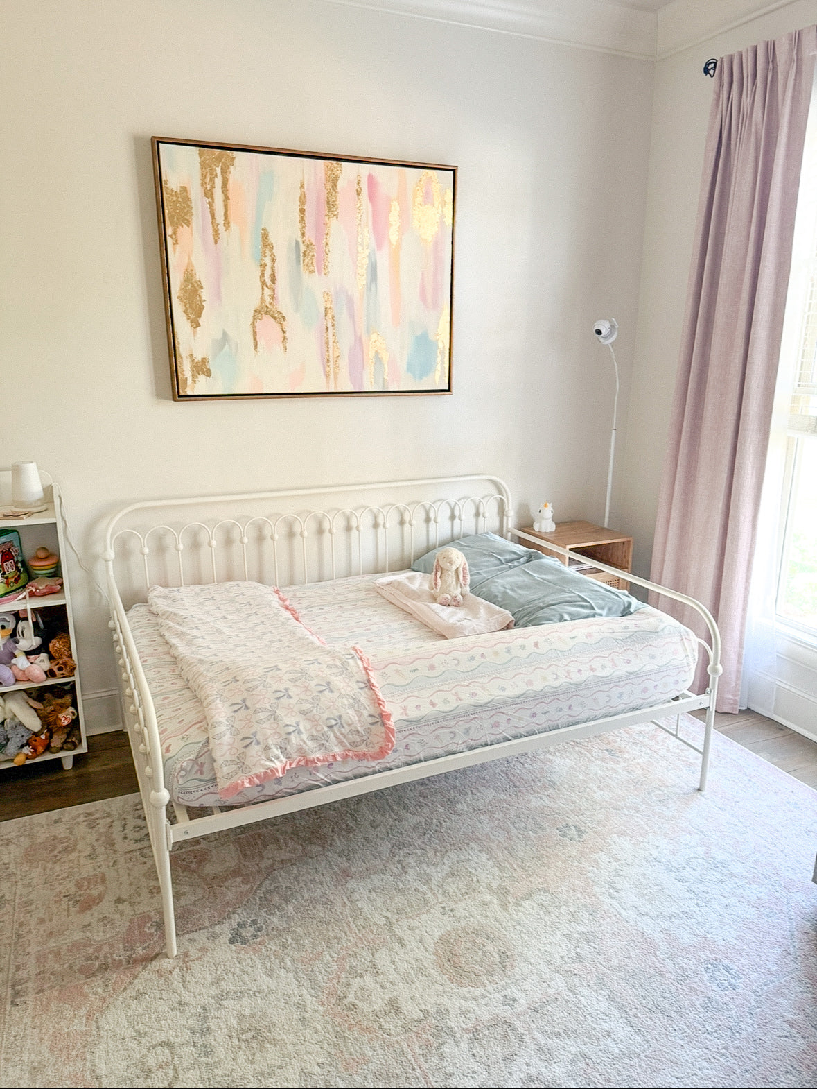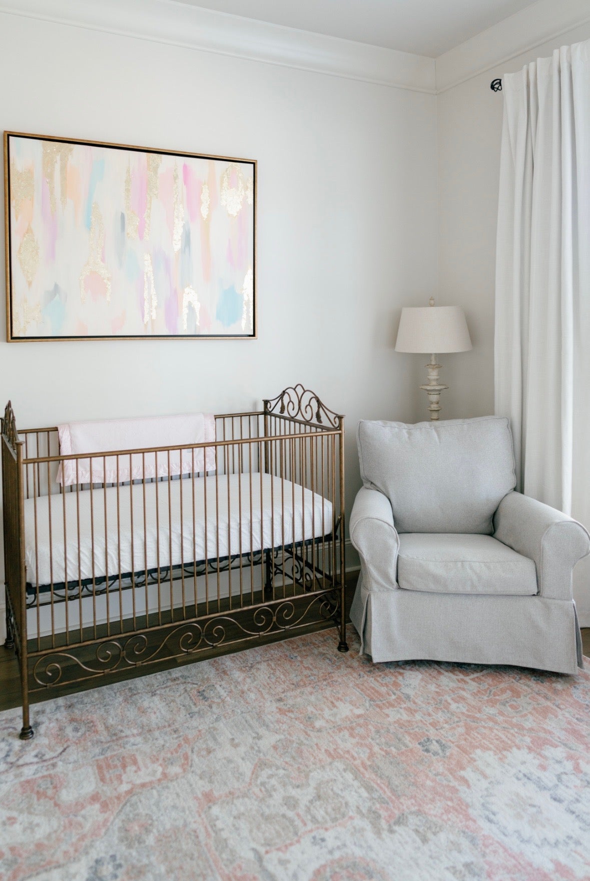 MK hopes that this sweet pink, cream, lavender, gray, blue, and gold piece will be a testament and reminder of God's promises in your home.