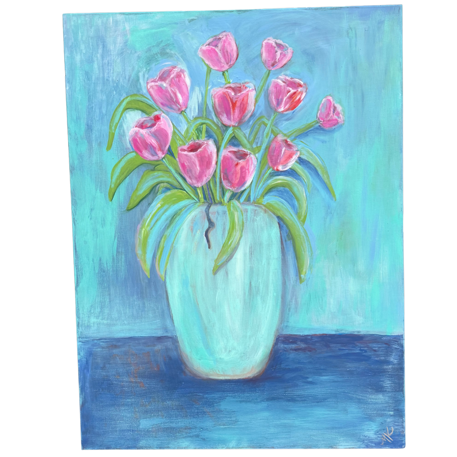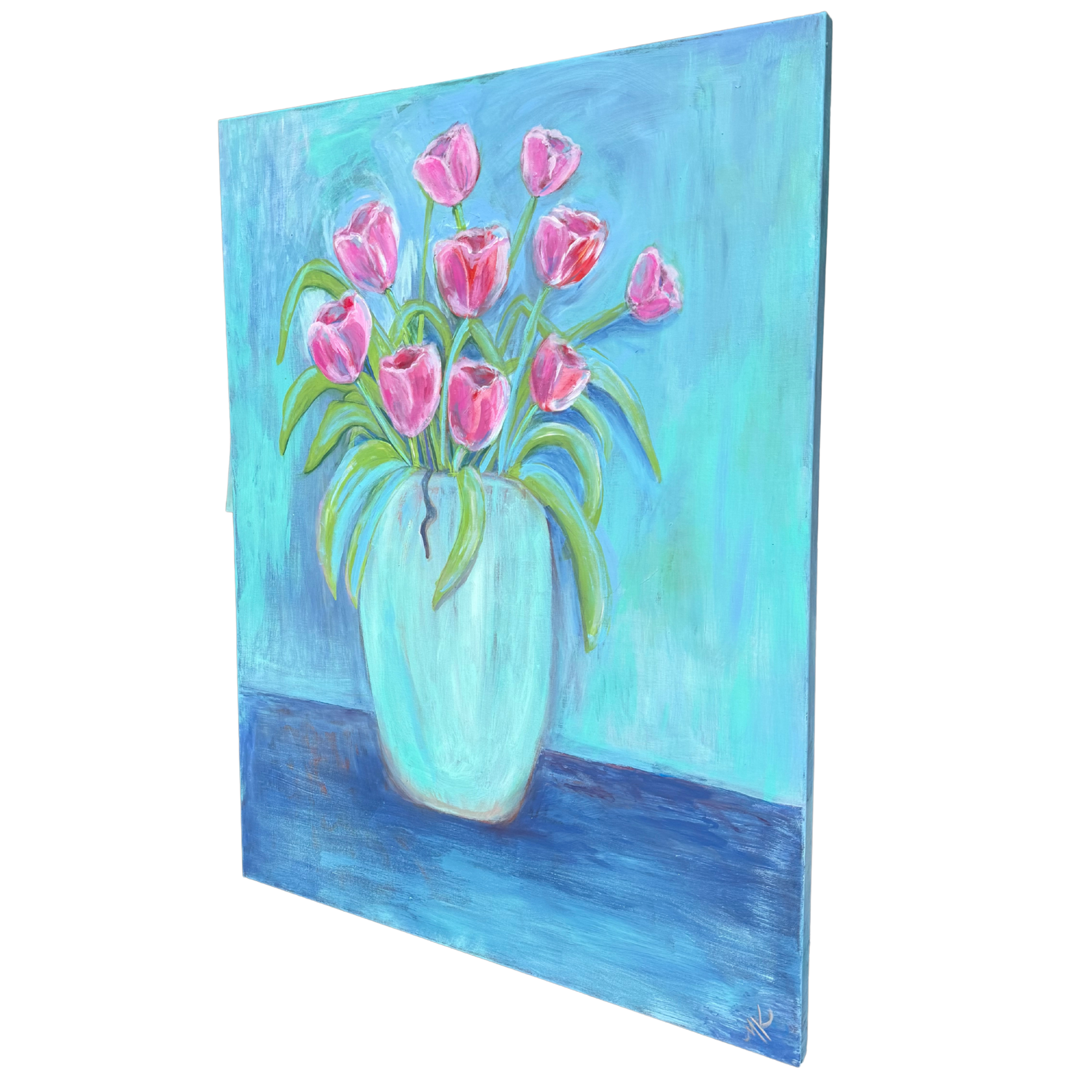 “Tiptoe Through The Tulips” is a fresh, breath of fresh air for your home that will add joy and beautiful color! A stunning McCarty pottery vase in jade with navy accents sets the tone for a gorgeous color palette in this pretty painting!